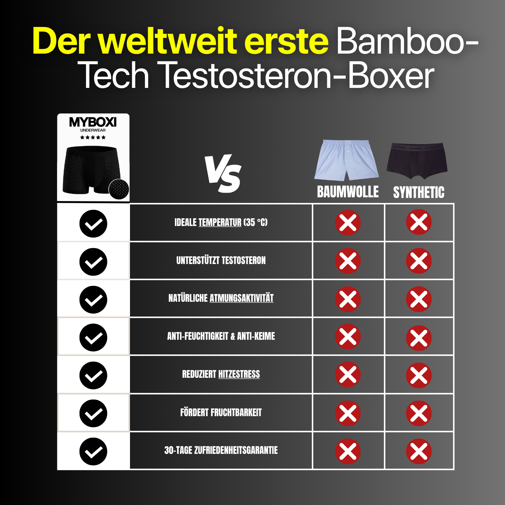 Mit MYBOXI haben wir Boxershorts aus Bambus geschaffen – weich, atmungsaktiv und frei von Chemikalien, entwickelt, um die Fruchtbarkeit zu schützen und unvergleichlichen Komfort zu bieten.