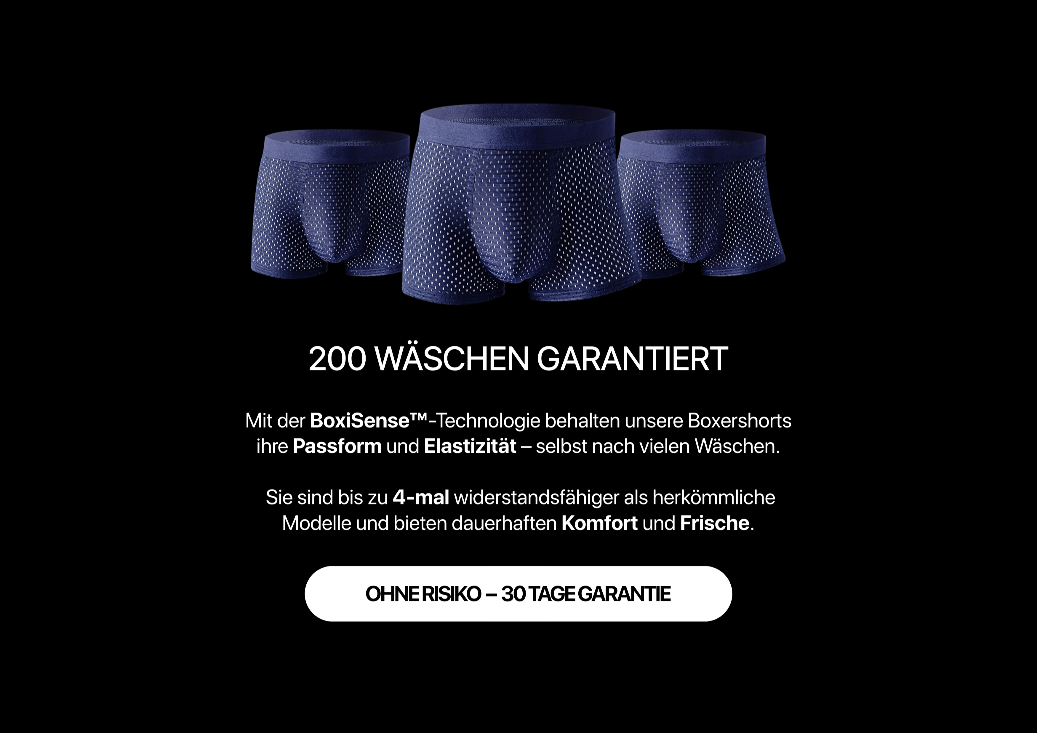 Schluss mit Boxershorts, die einengen, überhitzen und schnell verschleißen. Mit BoxiSense™ bieten unsere hochwertigen Bambusfasern außergewöhnliche Weichheit, natürliche Atmungsaktivität und einen Halt, der jede Bewegung mitmacht. Weniger Reibung, weniger Feuchtigkeit, mehr Komfort – für deine Vitalität und dein Wohlbefinden im Alltag.