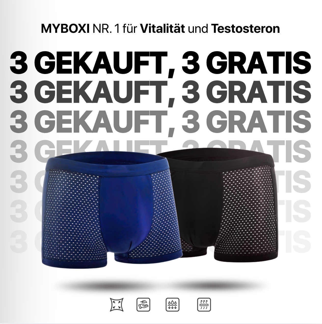 Das bedeutet: Sie kaufen 3 MYBOXI-Boxershorts, und wir schenken Ihnen 3 weitere völlig kostenlos dazu.